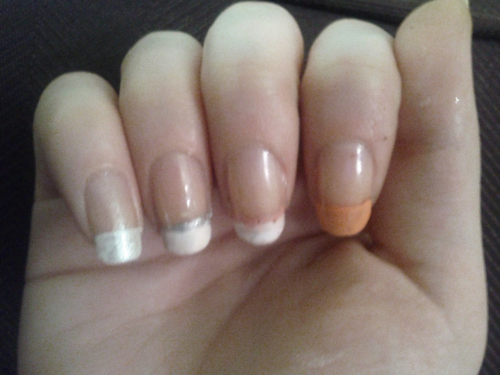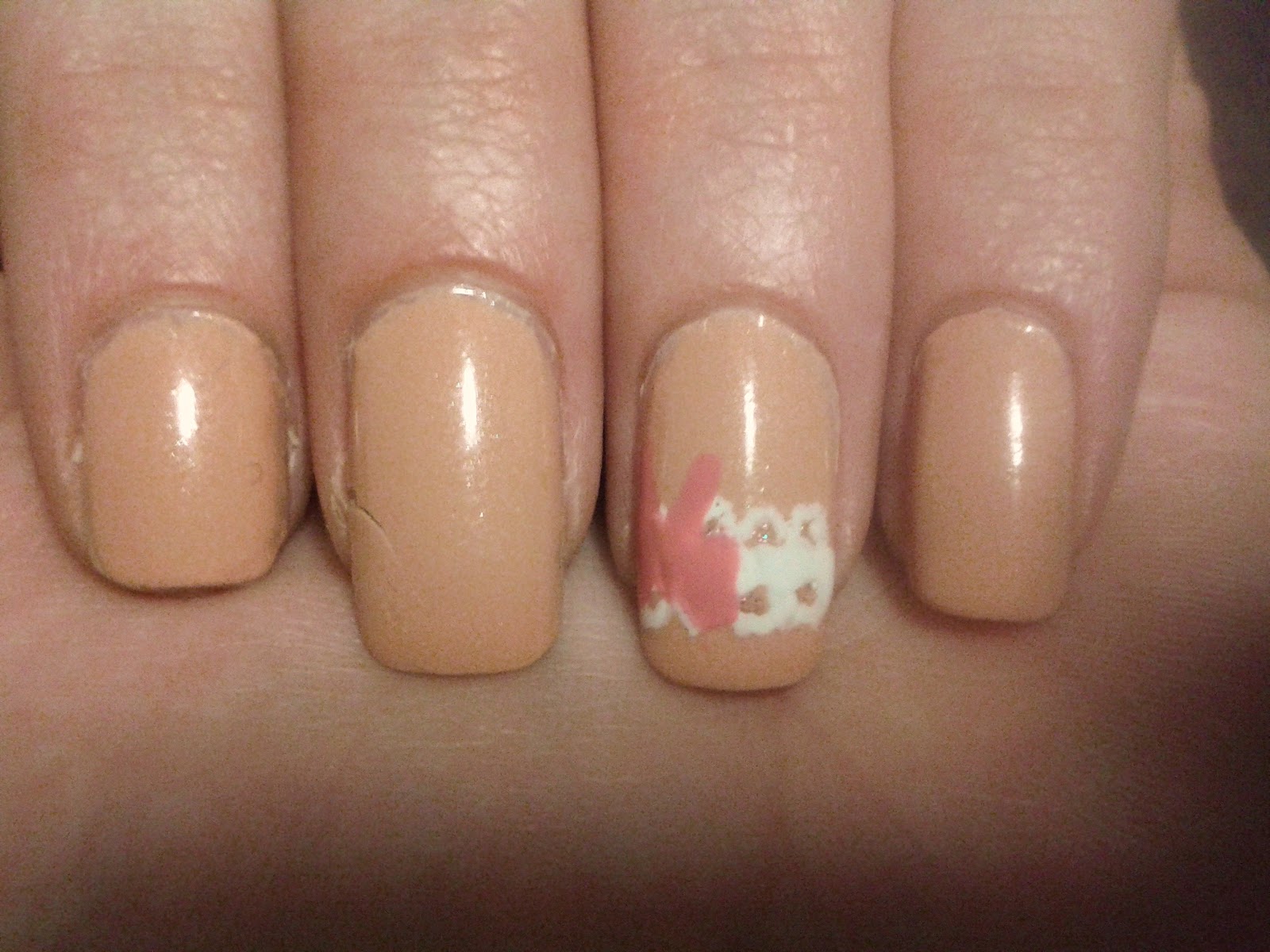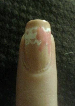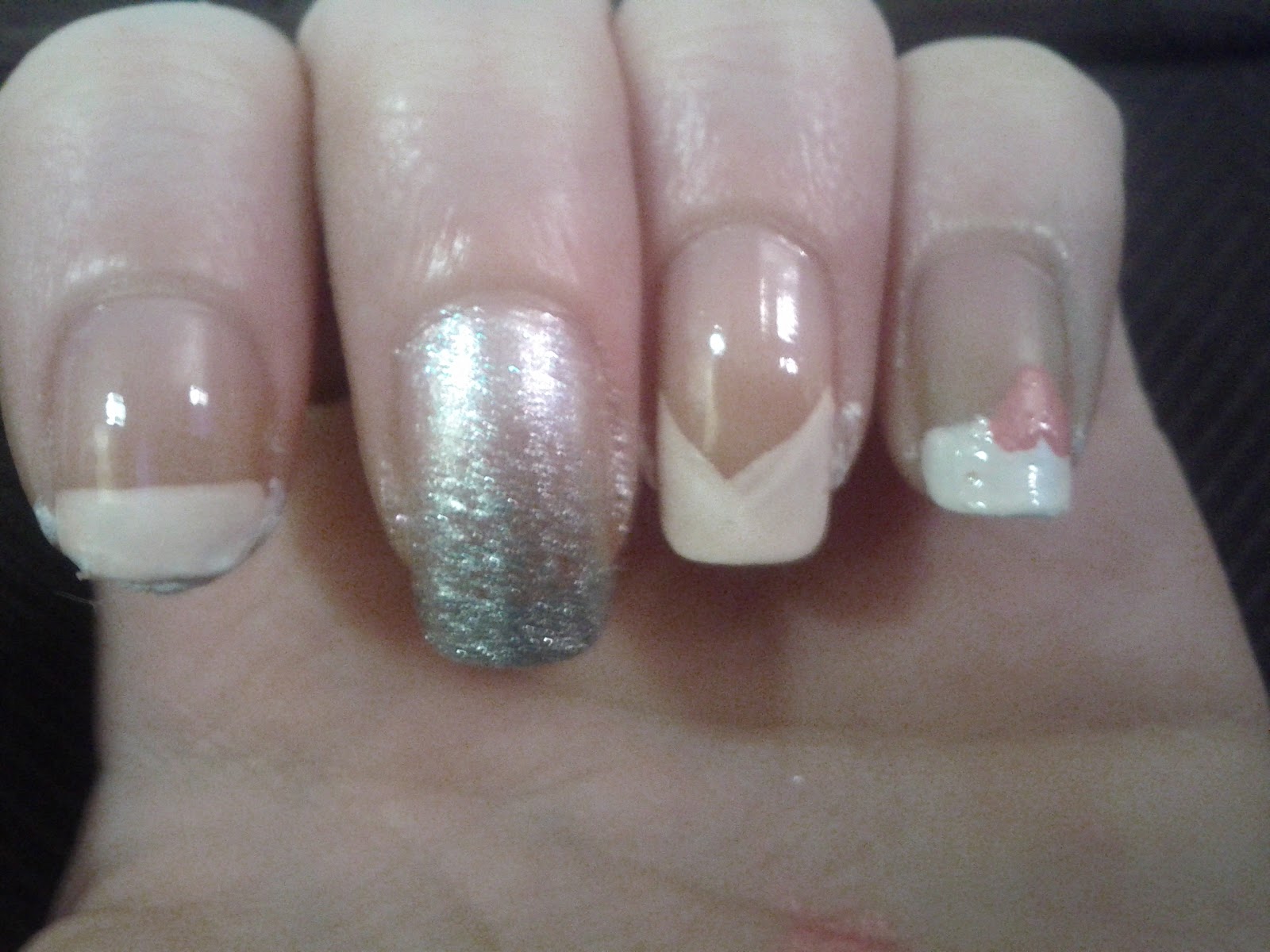 So I promised bridal nails quite some time ago… Sorry about that; this semester was a bitch. I actually did these over a month ago and never posted them. Please forgive my atrocious cuticles and broken nails. At least my short pointer finger allows me to demonstrate that a proper french manicure can make a short nail look longer.